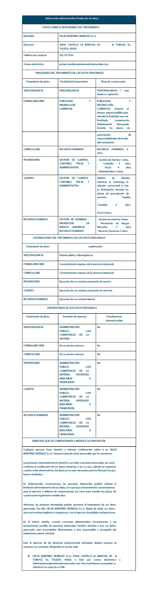 II. INFORMACIÓN SOBRE EL RESPONSABLE Y TRATAMIENTOS DE LOS DATOS PERSONALES EN VELAS MARTÍNEZ MORALES S.L.U.